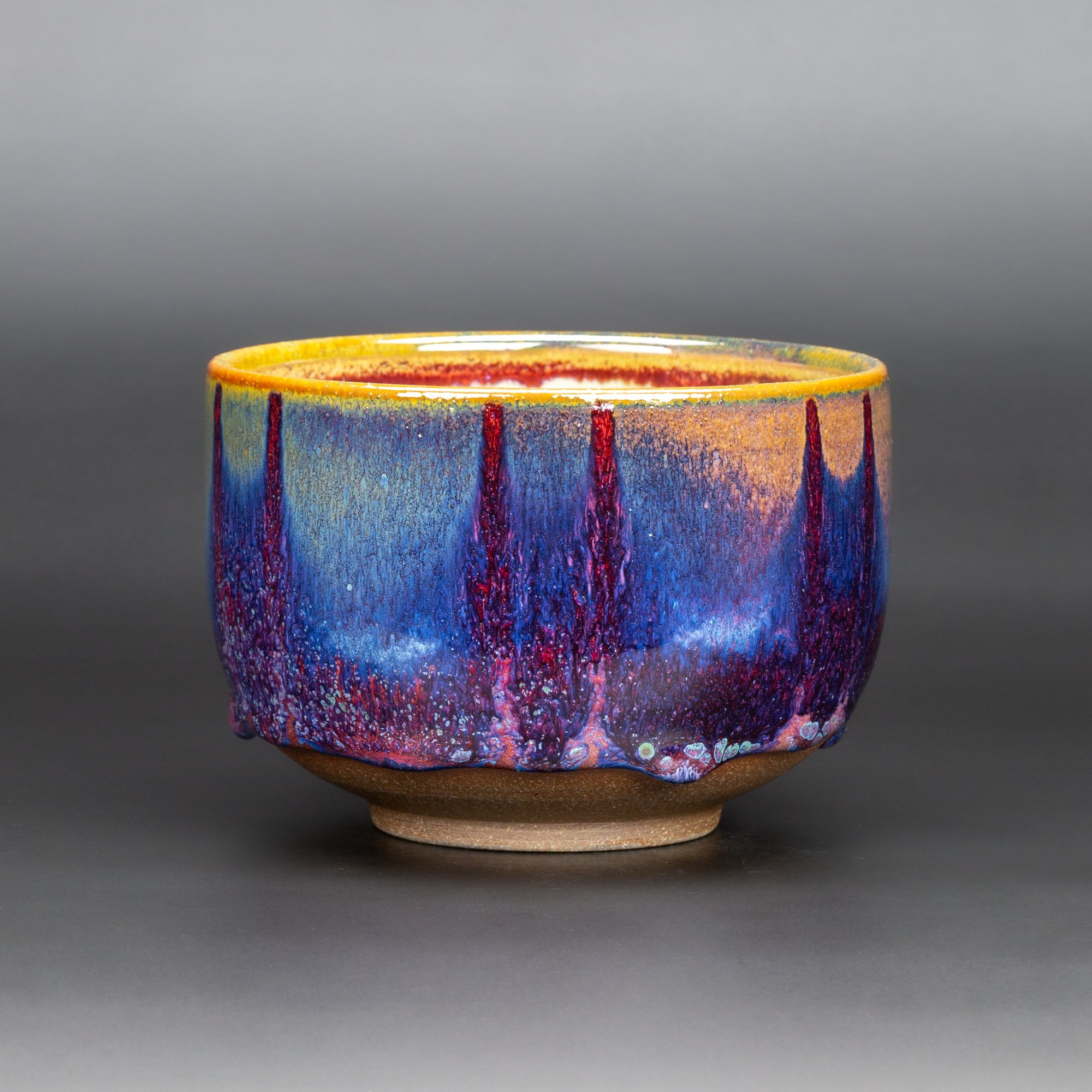 Wheel thrown dark stoneware, layered and hand painted glazes, reduction fired to 1310 degrees C.