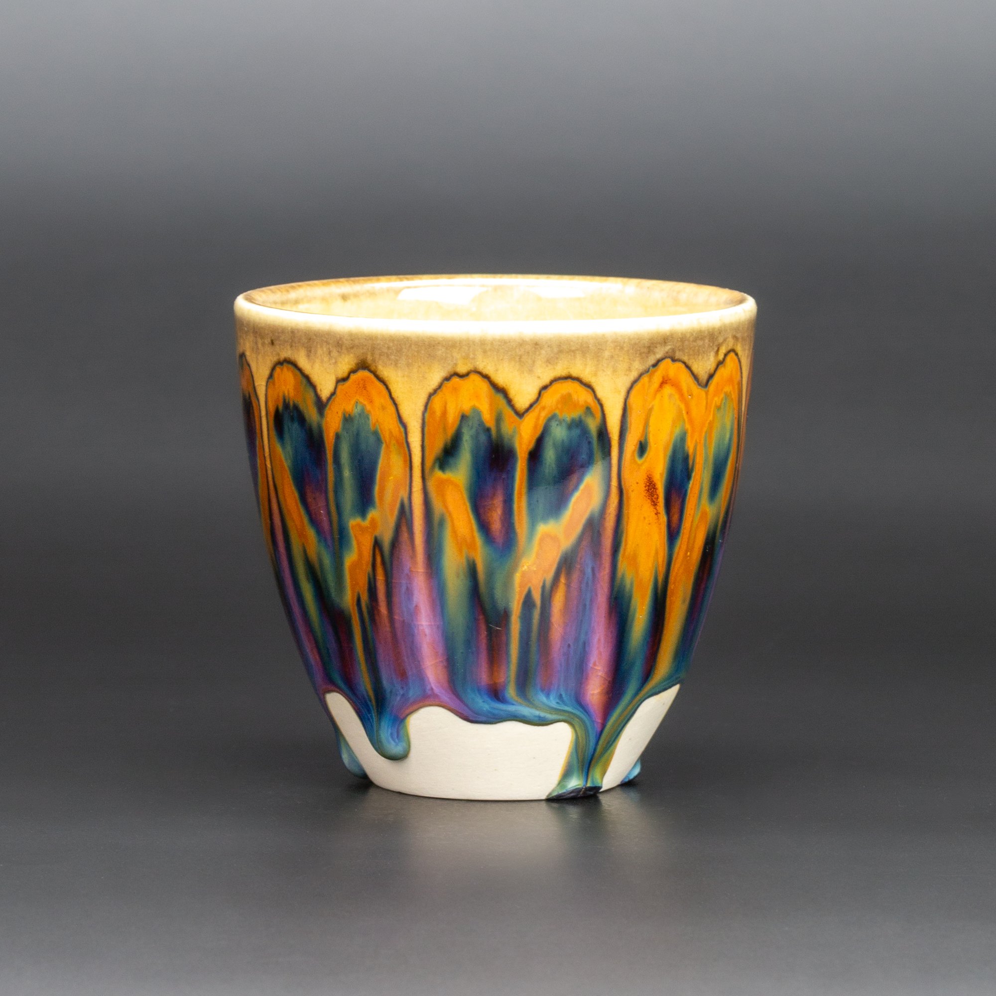 Wheel thrown fine white stoneware, layered and hand painted glazes, reduction fired to 1310 degrees C.