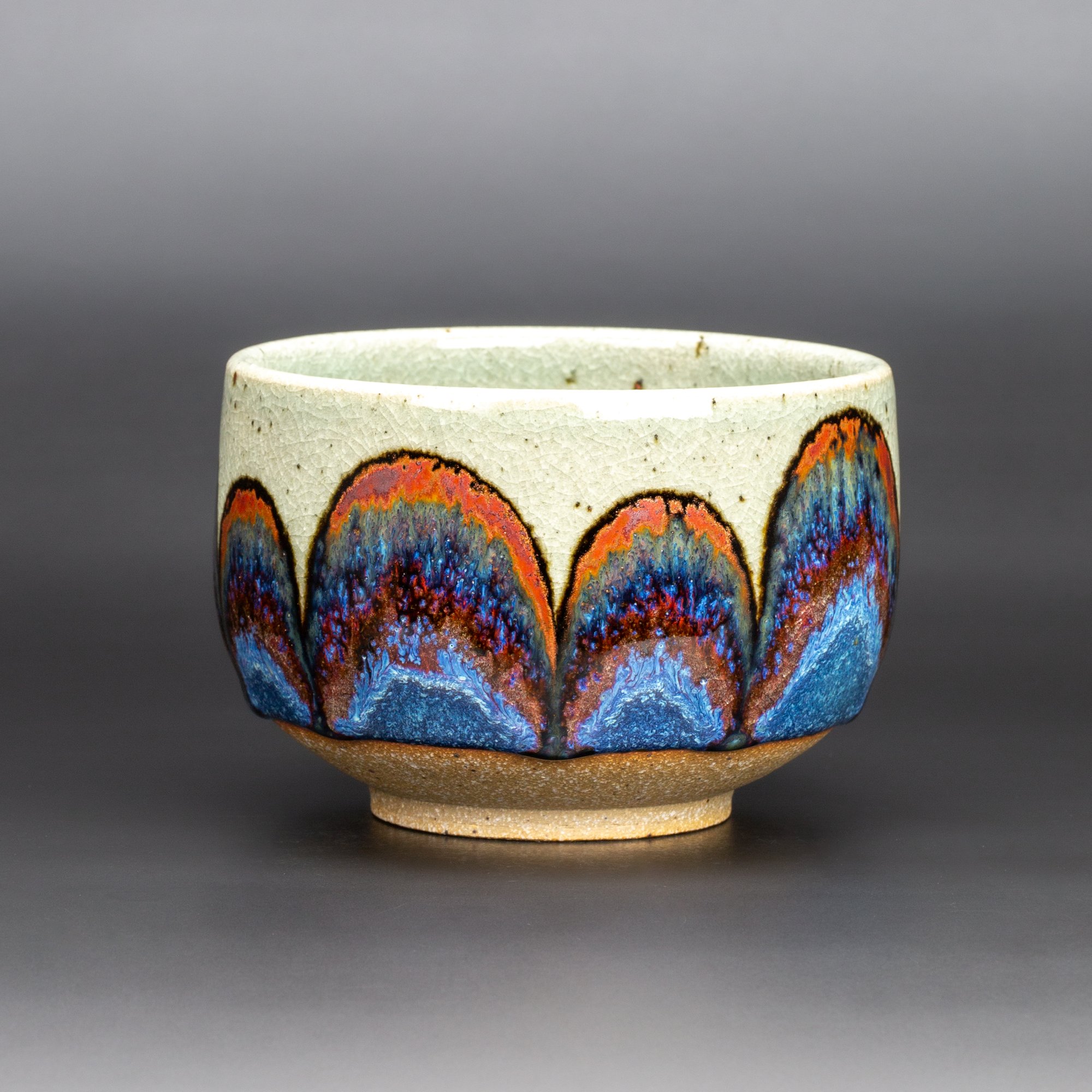 Wheel thrown buff stoneware, layered and hand painted glazes, reduction fired to 1310 degrees C.
