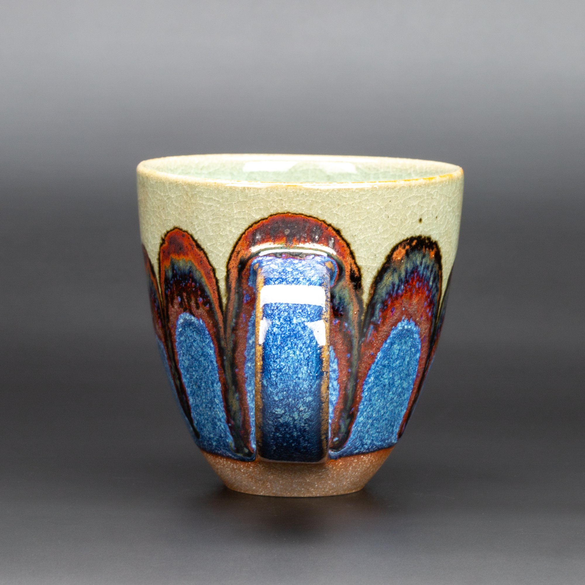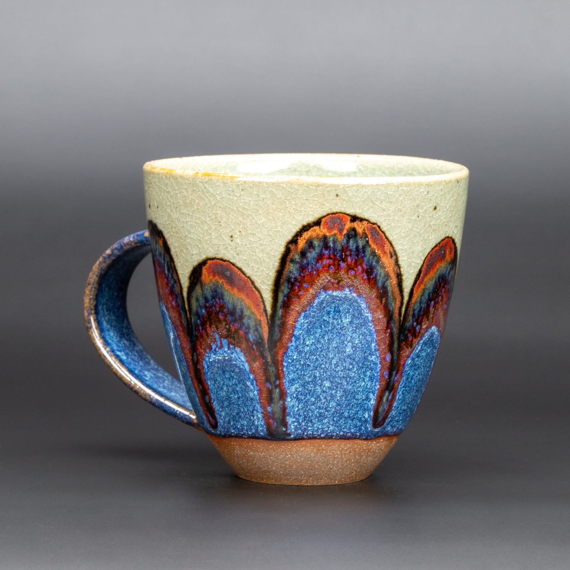 Wheel thrown dark stoneware, layered and hand painted glazes, reduction fired to 1310 degrees C.